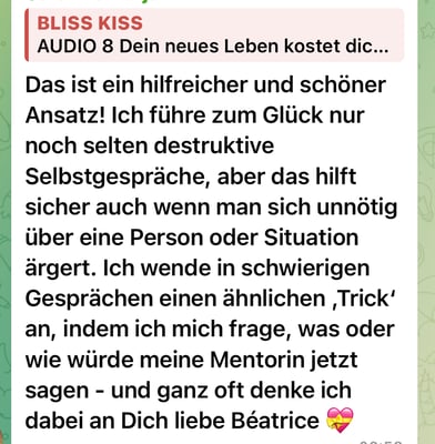 „Herzensdank liebe Béatrice für deine weisen Worte. Sie haben mich berührt, aufgerüttelt und wachsen lassen. Ich bin endlich in mein Neues aufgewacht und spüre gerade nur tiefe Dankbarkeit“