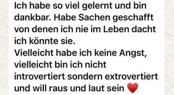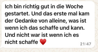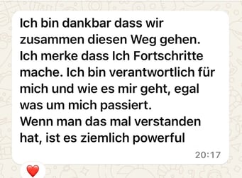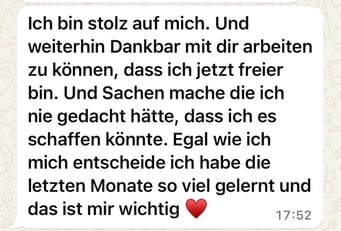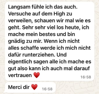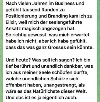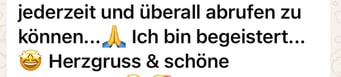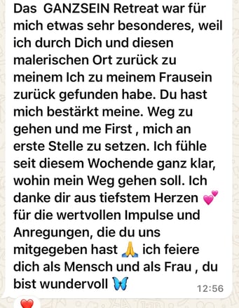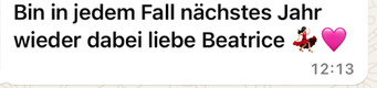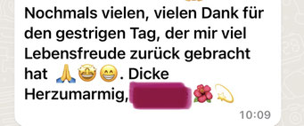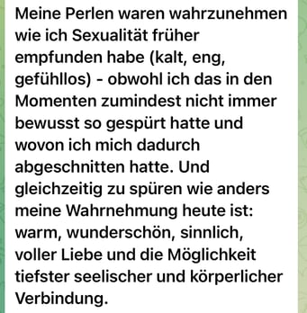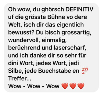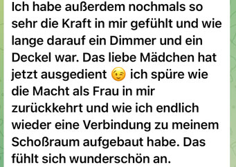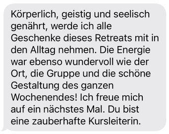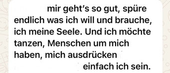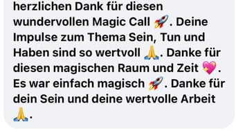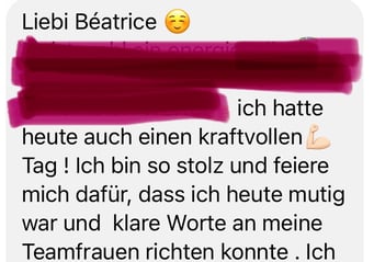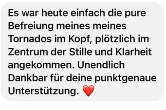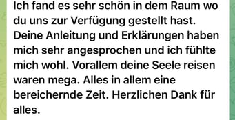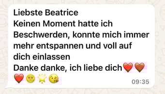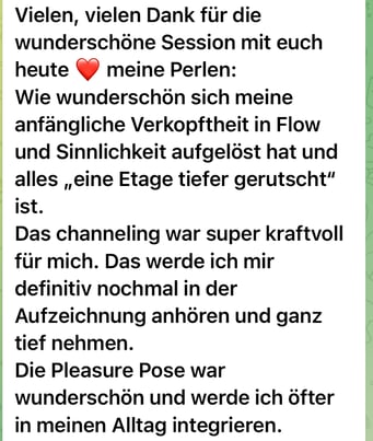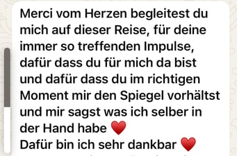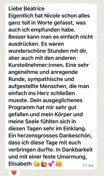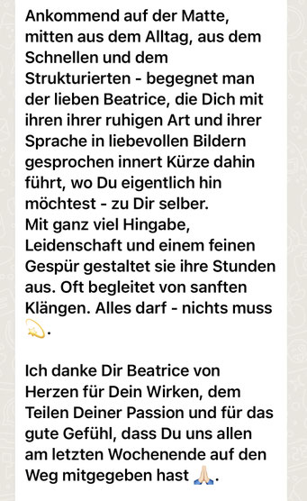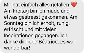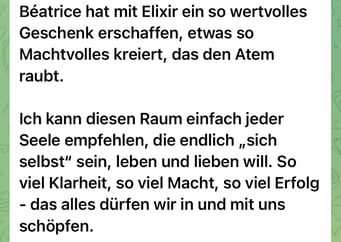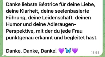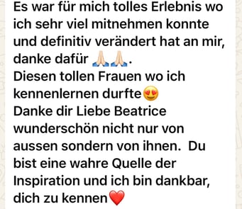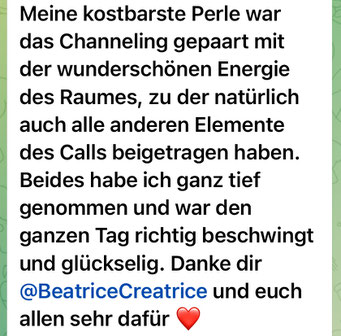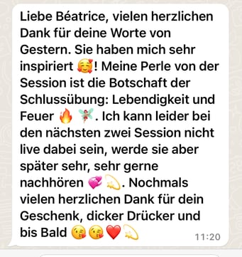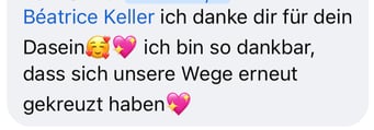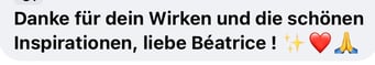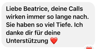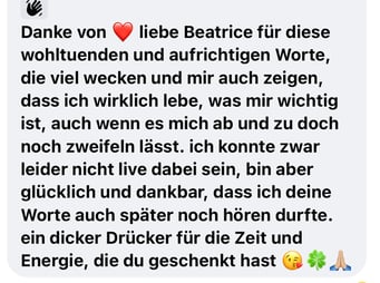 «Das 1:1 mit Béatrice war sehr besonders, weil sie mich so sehr gespürt hat! Ich konnte erkennen was gerade in mir zu einer Blockade führt, es loslassen und transformieren. In dem Raum, den Béatrice mir geöffnet und gehalten hat, konnte ich mich vertrauensvoll hingeben und sodann in meine ganze Grösse wachsen. Ich habe stets noch Tage später gespürt, was sich gelöst hat und was noch nachgehen durfte. Fühle mich jetzt stark und machtvoll und mutig dies auch sichtbar zu zeigen. Und auch andere Menschen mitzunehmen, ihre Kraft wieder zu finden.» ♾️❤️♾️