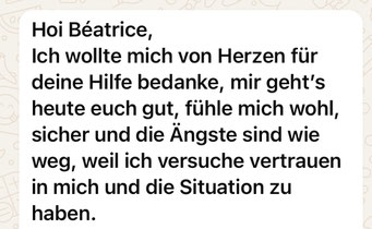 «Ich durfte Béatrice in einer Frauengruppe kennenlernen. Ihre Ausstrahlung hat mich magisch angezogen. Ihre Magie durfte ich in zwei Sitzungen spüren. Béatrice hat mir geholfen die richtigen Worte zu finden und hat mir in einer bedrohlichen Situation neuen Halt und Zuversicht zurückgebracht. Mit ihrer angenehmen Arbeitsweise brachte sie mich geschickt an den Punkt und half mir blinde Flecken zu erkennen. Gerne empfehle ich Béatrice weiter.»
